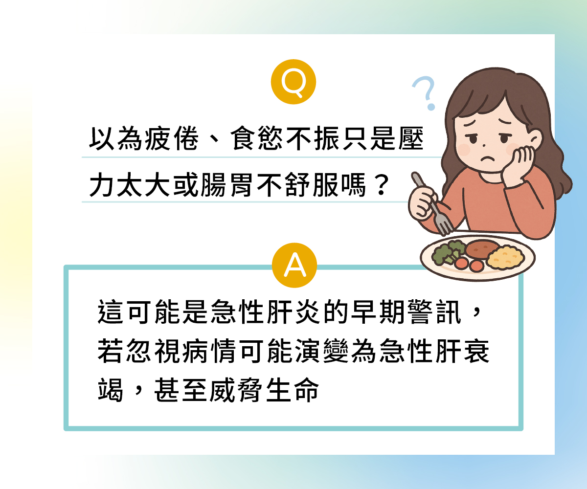 急性肝炎的可怕之處在於「不典型」。患者可能先有輕微腸胃症狀,後來才出現明顯警訊: