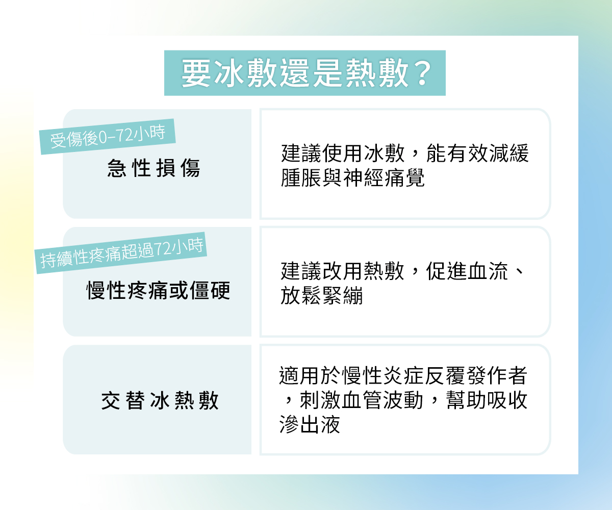 - 建議改用熱敷,每次15–20分鐘,1天2–3次,促進血流、放鬆緊繃。