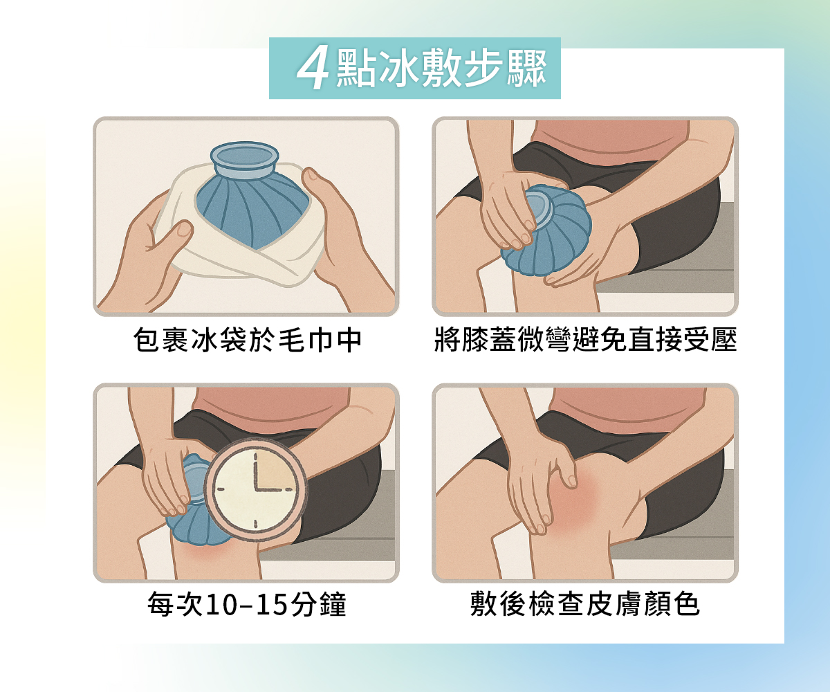- 冰敷:透過低溫收縮血管、抑制神經傳導,快速減輕腫脹與急性疼痛。