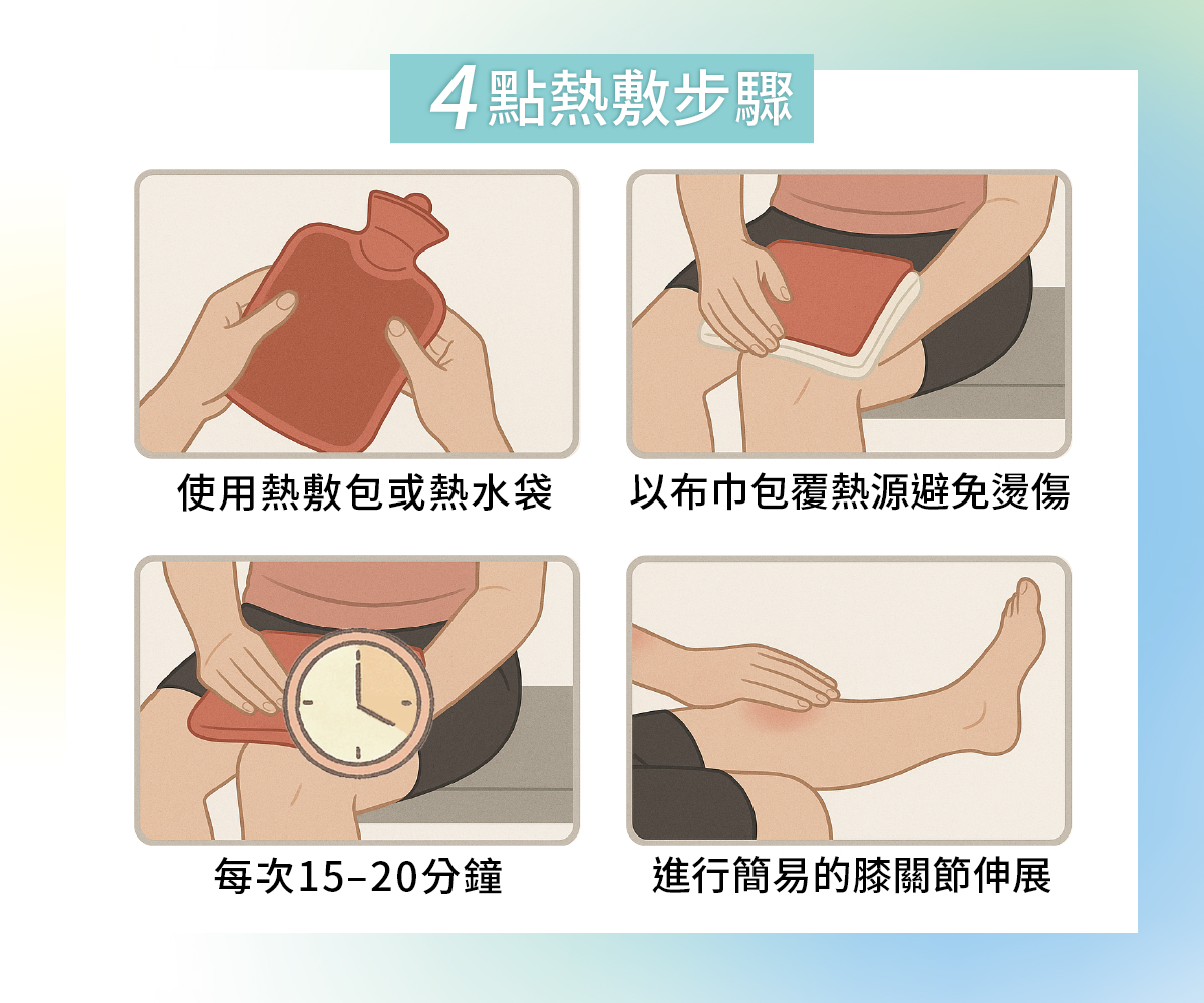 - 搭配動作:熱敷後可進行簡易的膝關節伸展與拉伸,如坐姿屈膝伸展。