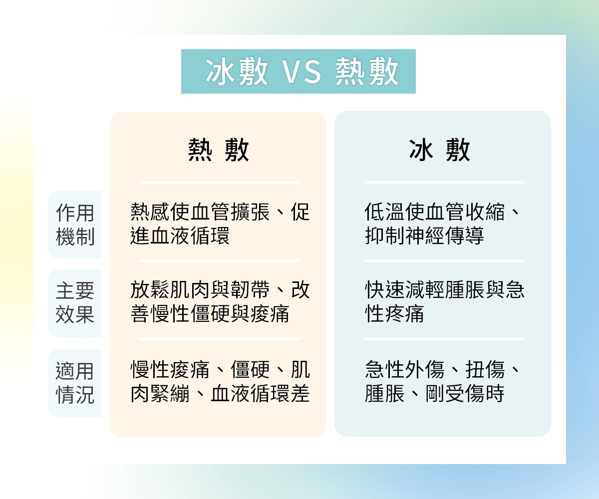 - 熱敷:利用熱感擴張血管、促進血液循環,放鬆肌肉與韌帶,改善慢性僵硬與痠痛。