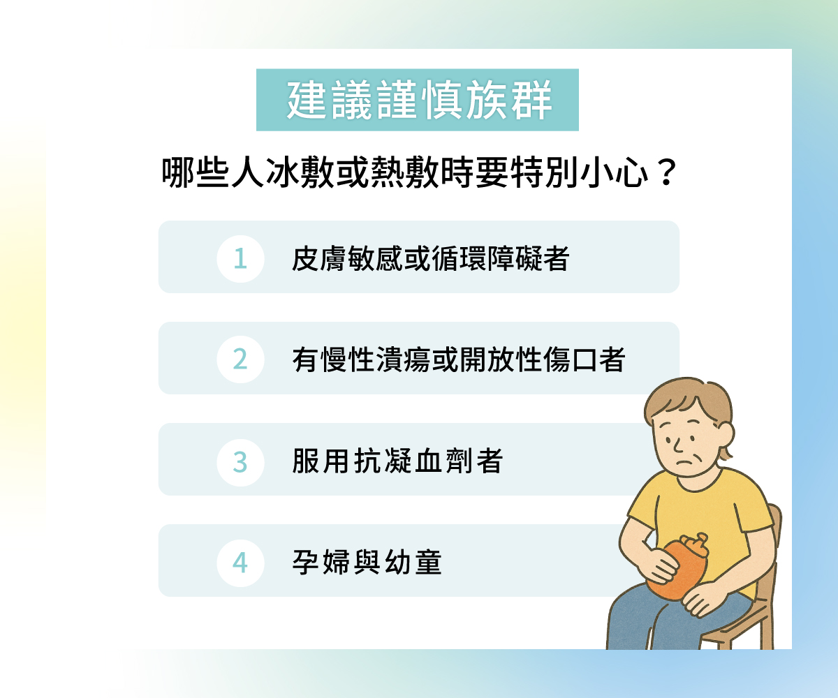 - 服用抗凝血劑者:冷熱敷均可能影響局部血管,須先諮詢醫師。