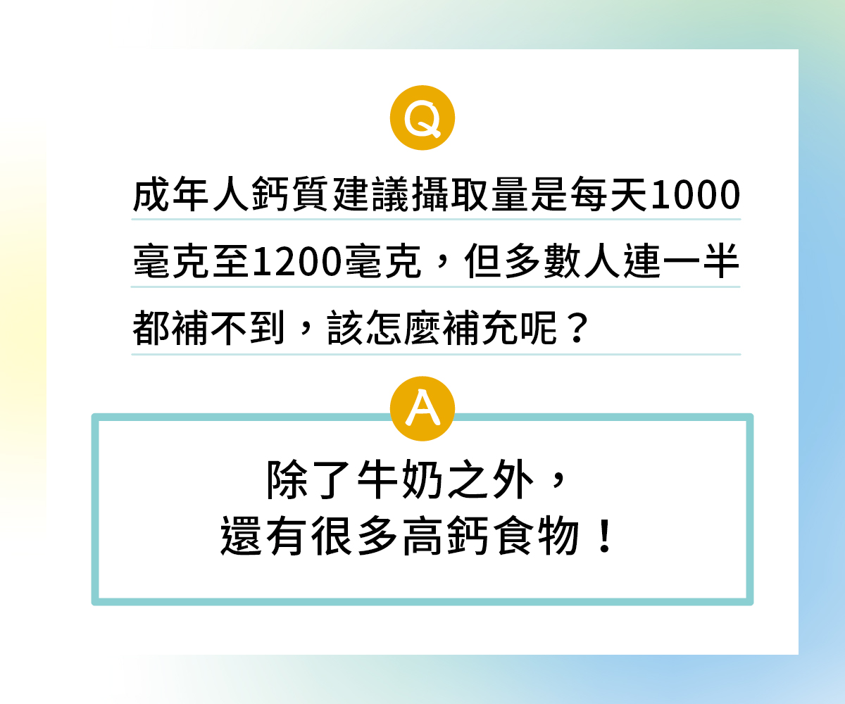 你知道嗎?成年人的鈣質建議攝取量為每天1000~1200毫克,但實際上,多數人連一半都補不到。